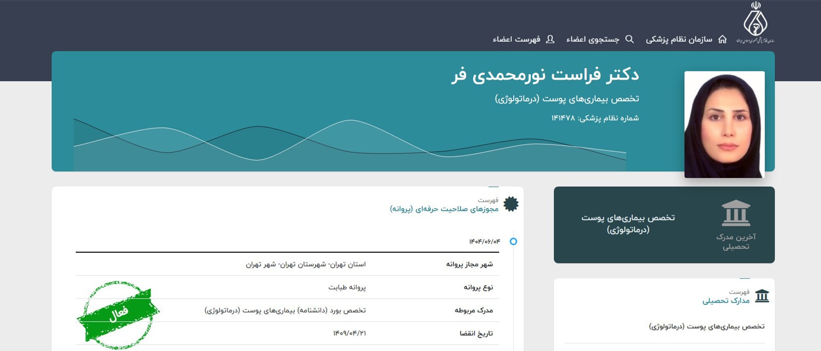 خانم دکتر فراست نورمحمدیفر دارای بورد تخصصی درماتولوژی و عضو انجمن متخصصین پوست ایران هستند. ایشان در زمینه درمان بیماریهای پوستی کودکان و بزرگسالان، مشاوره کاشت مو و خدمات زیبایی تخصص دارند. کلینیک ایشان در یکی از بهترین مناطق تهران قرار دارد.